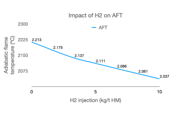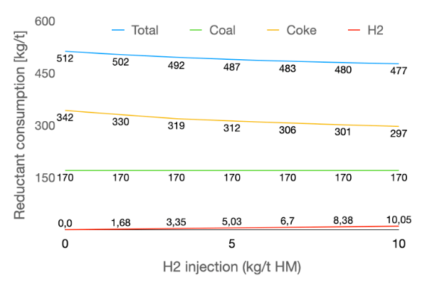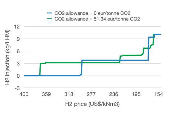 At a price of 22,700 eur/kg of H2, we observed an increase of 11.75 eur/t of slab in the production cost by injecting 10 kg/t HM.