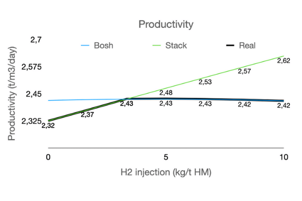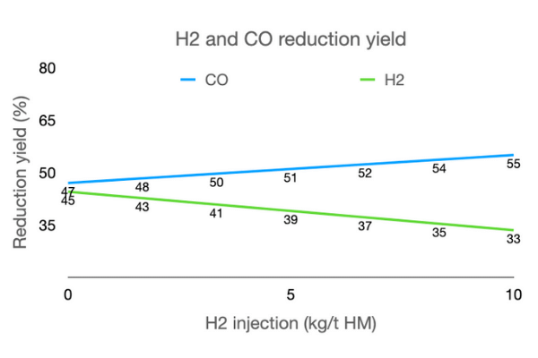 Additionally, the consumption of hydrogen has other operational impacts, which cannot be neglected. The main impacts are on the reduction yields of CO and H2, on the adiabatic flame temperature (AFT), and on the blast furnace productivity. The increase in H2 injection increases the reduction yield of CO (which means that the carbon is better used) as well as the blast furnace productivity. However, it reduces the H2 reduction yield (the proportion of reaction involving H2 actually compensates this), the AFT, and the permeability (due to the reduction of coke consumption). The last two are limiting factors of H2 injection. Check the numerical impacts:
